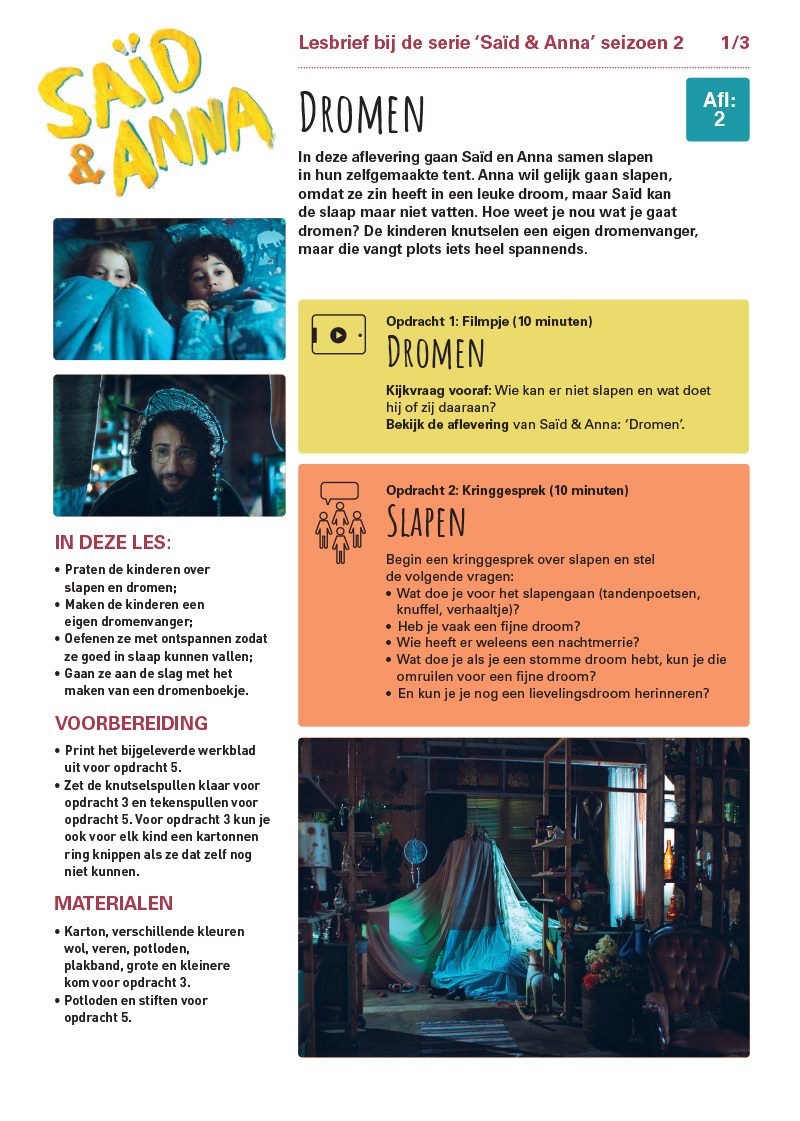 In deze aflevering gaan Saïd en Anna samen slapen in hun zelfgemaakte tent. Anna wil gelijk gaan slapen, omdat ze zin heeft in een leuke droom, maar Saïd kan de slaap maar niet vatten. Hoe weet je nou wat je gaat dromen? De kinderen knutselen een eigen dromenvanger, maar die vangt plots iets heel spannends.