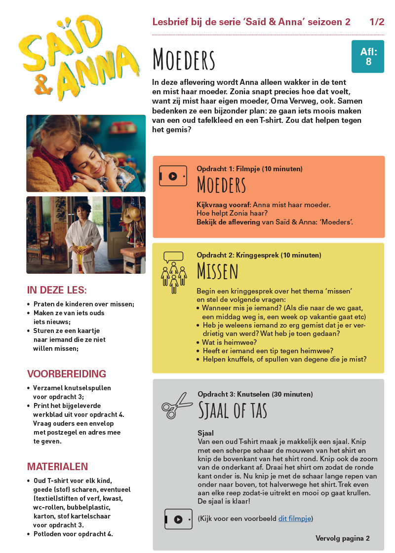 In deze aflevering wordt Anna alleen wakker in de tent en mist haar moeder. Zonia snapt precies hoe dat voelt, want zij mist haar eigen moeder, Oma Verweg, ook. Samen bedenken ze een bijzonder plan: ze gaan iets moois maken van een oud tafelkleed en een T-shirt. Zou dat helpen tegen het gemis?